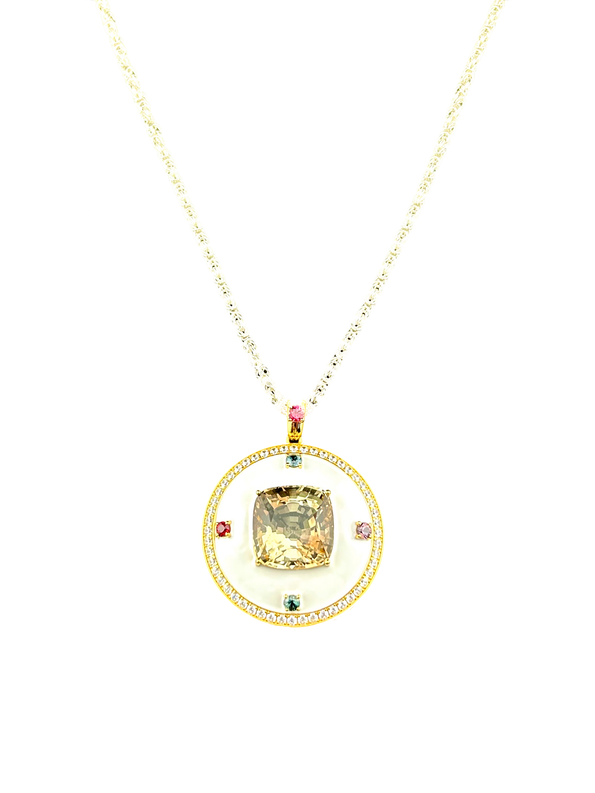 這件作品以白色琺瑯為基底,主石為閃耀的黃水晶,搭配五顆象徵行星軌道的尖晶石衛星寶石,外圈鑲嵌晶亮水晶,如星河閃爍。