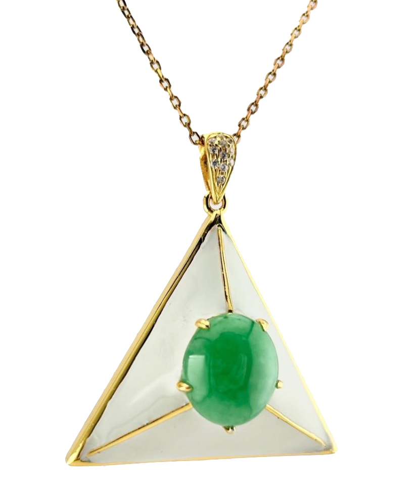 這件作品結合了純手工金工與琺瑯工藝,以金字塔造型襯托出緬甸玉的靜謐與內斂之美。琺瑯的製作工序繁複,往往需經八至十五道精細工序,每一次燒製皆是對色彩與耐心的考驗。這樣的反覆淬鍊,成就了作品最終的光澤與深度。